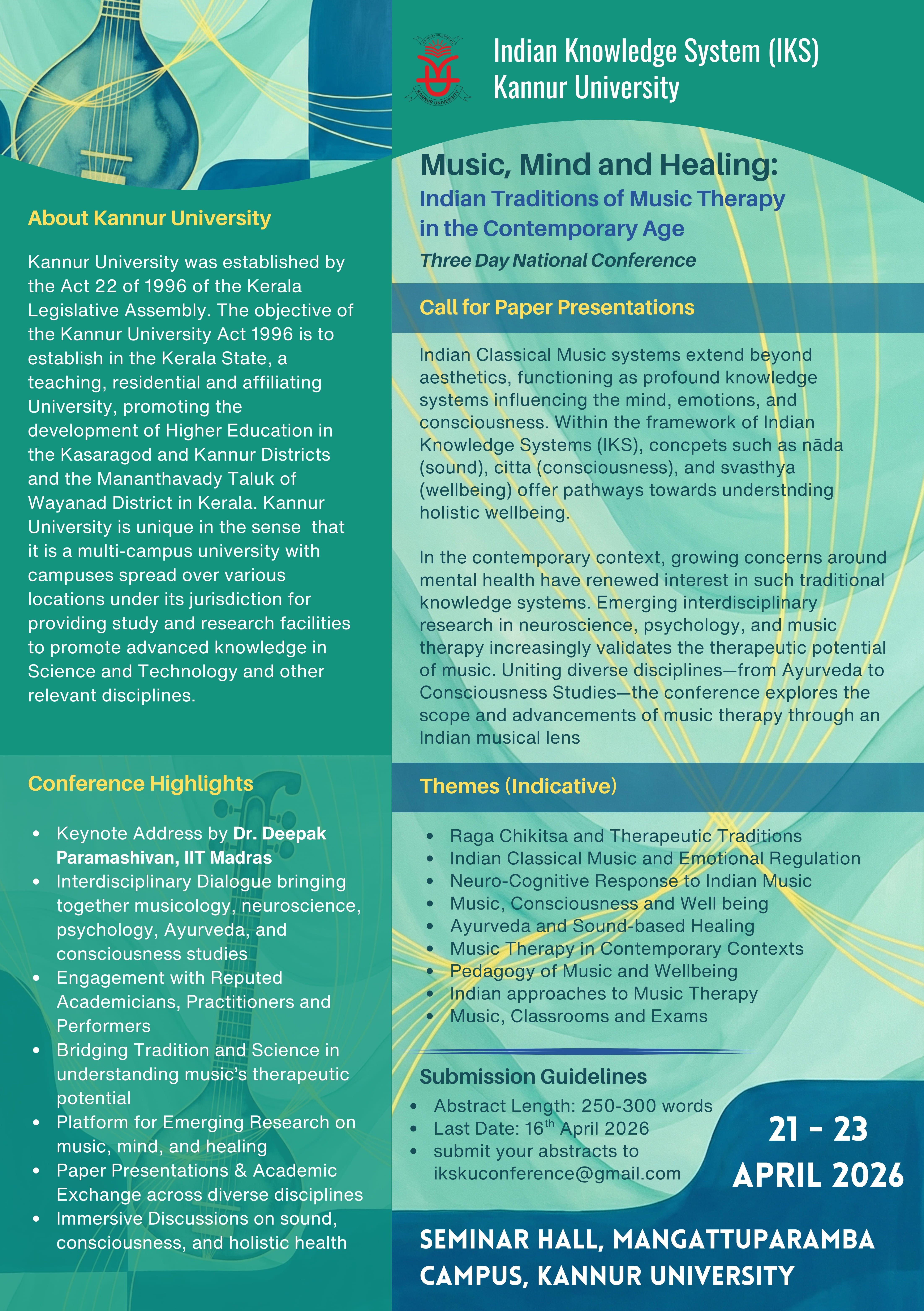 Three-Day National Conference On Music, Mind and Healing: Indian Traditions of Music Therapy in the Contemporary Age Organized by Indian Knowledge System (IKS), Kannur University