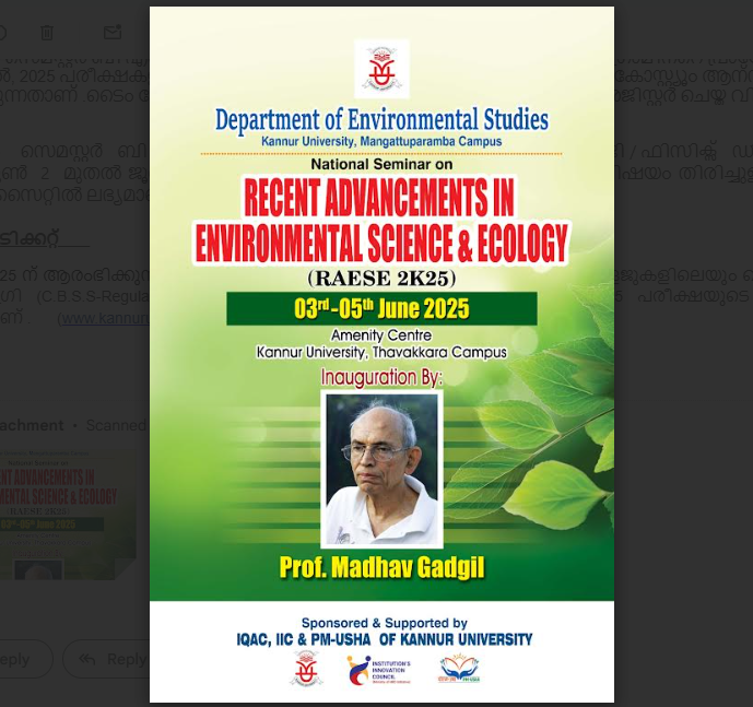 കണ്ണൂർ യൂണിവേഴ്സിറ്റി മാങ്ങാട്ടുപറമ്പ ക്യാമ്പസിലെ പരിസ്ഥിതി പഠന വകുപ്പ്, യൂണിവേഴ്സിറ്റിയുടെ ഐ.ക്യൂ.എ.സി യുടെ സഹകരണത്തോടെ സംഘടിപ്പിക്കുന്ന ത്രിദിന ദേശീയ സെമിനാറിന് ജൂൺ 3 , ചൊവ്വാഴ്ച കണ്ണൂർ യൂണിവേഴ്സിറ്റി താവക്കരയിൽ തുടക്കമാവും. "പരിസ്ഥിതി ശാസ്ത്ര മേഖലയിലെ ആധുനിക മുന്നേറ്റങ്ങൾ "എന്ന വിഷയത്തെ ആസ്പദമാക്കി നടത്തുന്ന കോൺഫറൻസ് ലോകപ്രസിദ്ധ പരിസ്ഥിതിശാസ്ത്രജ്ഞനായ പ്രൊഫസർ മാധവ് ഗാഡ്ഗിൽ ഉദ്ഘാടനം ചെയ്യും. പരിസ്ഥിതിശാസ്ത്ര മേഖലയിൽ പ്രവർത്തിക്കുന്ന കേരളത്തിനകത്തും പുറത്തുനിന്നുമുള്ള സീനിയറായ ശാസ്ത്രജ്ഞന്മാരും പ്രൊഫസർമാരും വിവിധ വിഷയത്തിൽ അവതരണം നടത്തും. അതേപോലെ ഇരുപത്തഞ്ചോളം ഗവേഷകർ അവരുടെ പുതിയ കണ്ടെത്തലുകൾ ഈ സെമിനാറിൻറെ ഭാഗമായി അവതരിപ്പിക്കുന്നുണ്ട്.