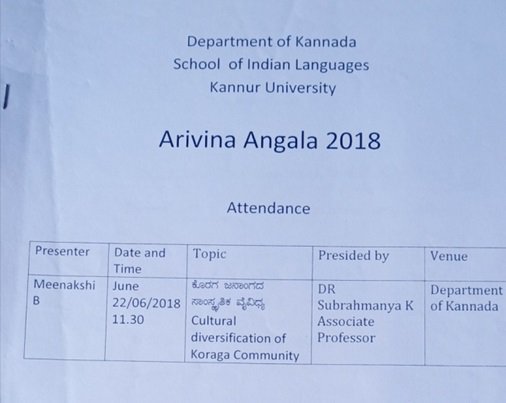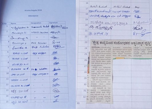 The third progrmme of Arvina Angala organized on 22/06/2018. Associate Professor , Govt College Bettampady Dr Subrahmnaya K presided over the programme. Former Course Director Dr U Maheshwari felicitated the programme. Meenakshi B presented paper. Course Director Dr Rajesh B was present. Male: 8 Female:13 Total 21