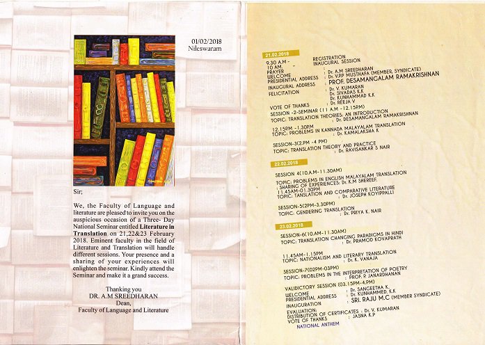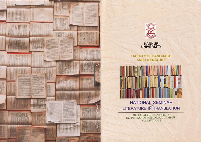 National Seminar entitled Literature in Translation on2018 February 21,22,23 conducted at Dept.Of Malayalam Dr.P.K.Rajan Memorial Campus at Nileshwar. Inagural session started with registration and prayer on 21/02/3018.Welcome speech was done by Dr.A.M Sreedharan (Hod Malayalam & Campus Director).Dr.V.P.P Musthafa (Member Syndicate) presided over the function and Prof. Desamangalam Ramakrishnan made the inaugural address .Dr.V.Kumaran(HOD Hindi) Dr.Sivadas K.K(Asst.professor) and Dr.Kunhahammad .K.K offered felicitation speech .This session ended with the vote of thanks by Dr.Reeja.V (Asst. professor, Department of Malayalam) . Session 2 of the first day topic presented by Dr.Desamangalam Ramakrishnam under the title Translation theories and Introduction was the first one followed by Dr.Kamalaksha and his topic was problems in Kannada Malayalam Translation .The last in the session entitled Translation theories and Practice was of the Dr.Ravishakar.S.Nair .This concluded the first day session. On 22/ 02/2018 three papers presented ,first was by Dr.K.M Shereef and his topic was Problems in English Malayalam Translations Shearing of Experiences. Dr.Joseph Koyippalli presented the paper under the title Comparative Literature. The last in this session was by Dr .Priya.K .Nair and her topic was Topic Gendering Translation this concluded the second day. Three papers presented in the day - 3 of the National Seminar Translation Changing Paradigms in Hindi was the name of the topic presented by Dr.Pramod Kovaprath and followed by Dr.K. Vanaja whose topic was Nationalism And Literary Translation. The last paper was presented by Prof.P.Jansrdhanan and topic was Problems in Interpretation of Poetry .In the Valedictory function Dr.Sangeetha .K made the welcome speech and the presidential address was given by Dr.Kunnahammed K.K ,Sri .Raju .M.C (Member Syndicate) inaugurated this Valedictory session. Certificates were distributed to the participants by Dr.V.Kumaran .Jasna .K.P made the vote of thanks .Total 55 members presented in this Seminar out of which 43 were Female and 12 were Male students. The three day National Seminar ended with National Anthem.