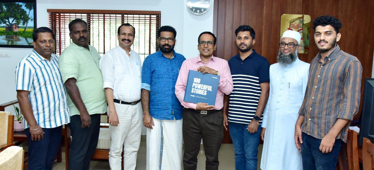 കണ്ണൂരിന്റെ വാണിജ്യ-വ്യവസായ മേഖലയിൽ വ്യത്യസ്തമായ ആശയങ്ങൾക്ക് നേതൃത്വം നൽകുന്ന സംരംഭകരുടെ വിജയകഥകളുടെ സമാഹാരമായ '100 പവർഫുൾ സ്റ്റോറീസ്' കോഫീ ടേബിൾ ബുക്ക് കണ്ണൂർ സർവകലാശാലയിൽ വൈസ് ചാൻസിലർ ഡോ. കെ.കെ സാജു വിതരണോദ്ഘാടനം നിർവഹിക്കുന്നു