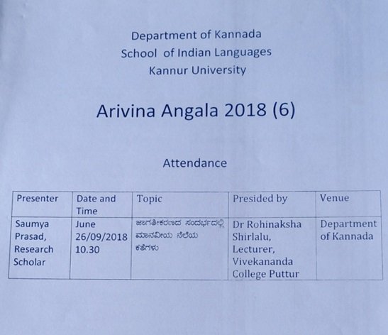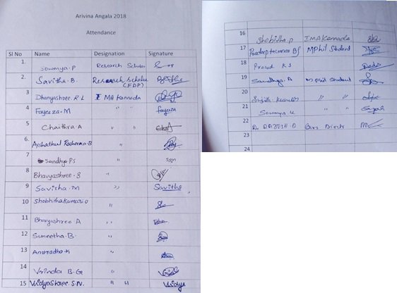 The sixth programme of Arivina Angala organized on 26/09/2019. Dr Rohinkasha Shirlalu, Assistant Professor Vivekananda College Puttur presided over the programme. Ph D Scholar Saumya Prasad Presented the paper. Dr Radhakrishan Bellur, Course Director Dr Rajesh B were present. Participants Male:5 Female 17 Total 22