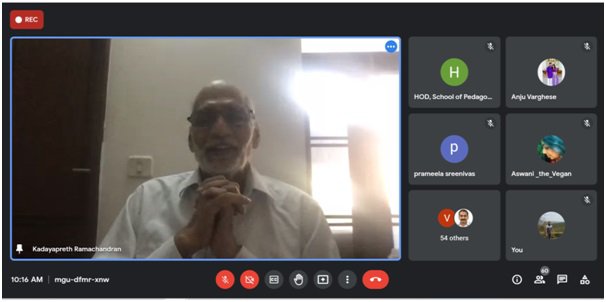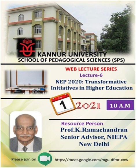 School of Pedagogical Sciences has conducted the 6th web lecture series on “NEP 2020: Transformative Initiatives in Higher Education” on 1st July 2021. The programme was conducted through the google meet (https://meet.google.com/mgu-dfmr-xnw). A total of 70 members have participated in the programme including faculties, research scholars and M. Ed students. Prof. K. Ramachandran, Senior Advisor, NIEPA-New Delhi was the resource person for the programme. Programme was started at 10.00 AM. In his lecture, he was focused about the major attractions of NEP 2020 with respect to higher education and research field. After the lecture, resource person has interacted with the participants. Dr. Jayaprakash R K, Head of the Department, has given the welcome address to the resource person and the participants. Mr. Abdul Hameed, Research scholar of the department has given the vote of thanks to the programme.