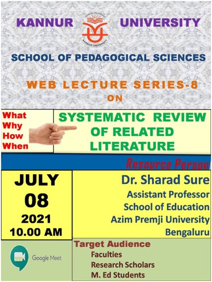 School of Pedagogical Sciences has conducted the 8th web lecture series on “Systematic Review of Related Literature” on 8th July 2021. The programme was conducted through the google meet. A total of 60 members have participated in the programme including faculties, research scholars and M. Ed students. Dr. Sharad Sure, Assistant Professor, Azim Premji University, Bengaluru was the resource person for the programme.