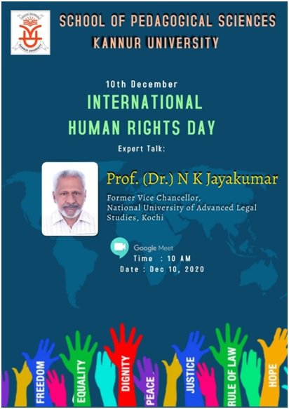 School of Pedagogical Sciences has conducted an expert talk as a part of International Human Rights Day Programme on 10th December 2021. Prof. N. K Jayakumar, Former Vice Chancellor, National University of Advanced Legal Studies, Kochi was the chief guest. The programme was conducted through google meet.